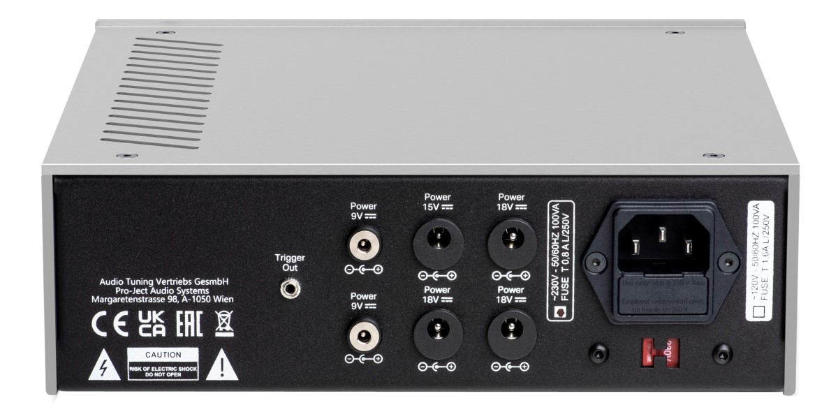 Lineární napájecí zdroj s filtrační kapacitou 10 000 μF pro až 5 zdrojových komponent Pro-ject a 1 gramofon s DC napájením 15 V